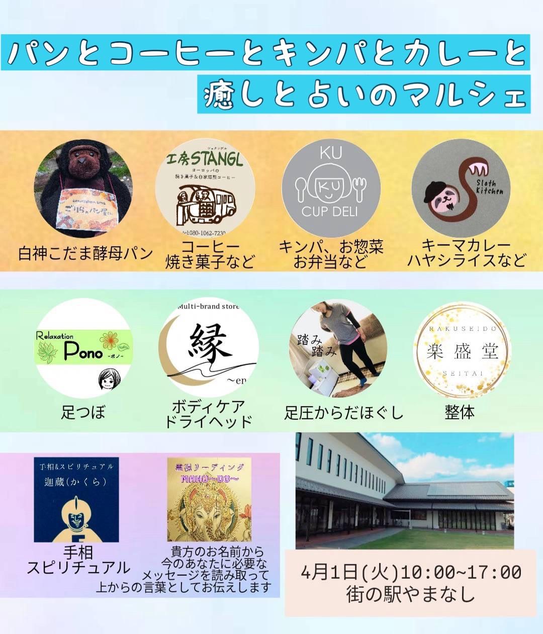 今度の4月1日(月)、『パンとコーヒーとキンパとカレーと癒しと占いのマルシェ』が、街の駅やまなしで行われます!