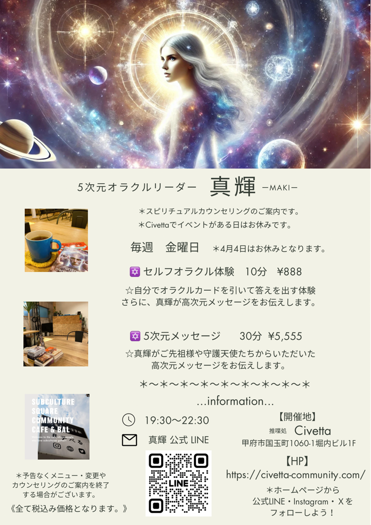 5次元オラクルリーダーの真輝さんによる「セルフオラクル体験」と「5次元メッセージ」を体験できるチャンスです。