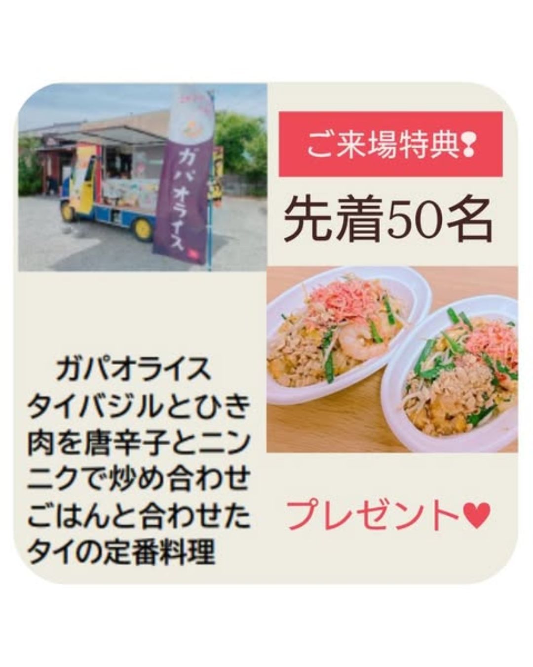 来場者プレゼントやキッチンカーでのタイ料理(先着50名様)もご用意しています!