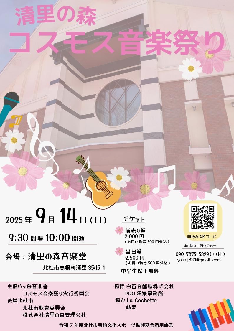 山梨の秋を彩る音楽と食の祭典「コスモス音楽祭り」が、清里の森にて開催されます。爽やかな高原の空気に包まれながら、すてきな演奏とワイン・チーズ・パンなど地元の美味しいお店を一度に楽しめる特別な一日です。