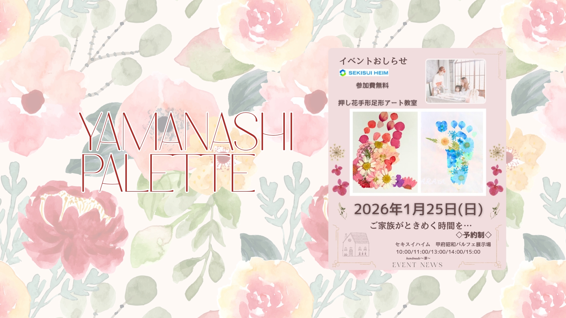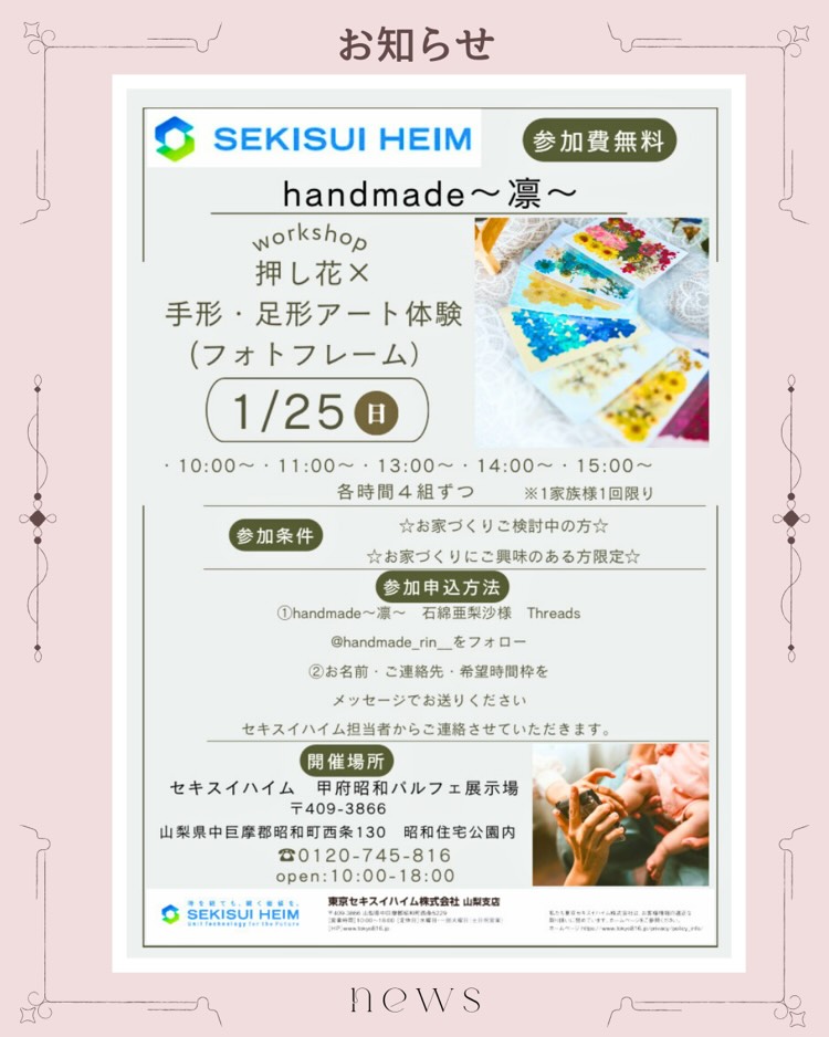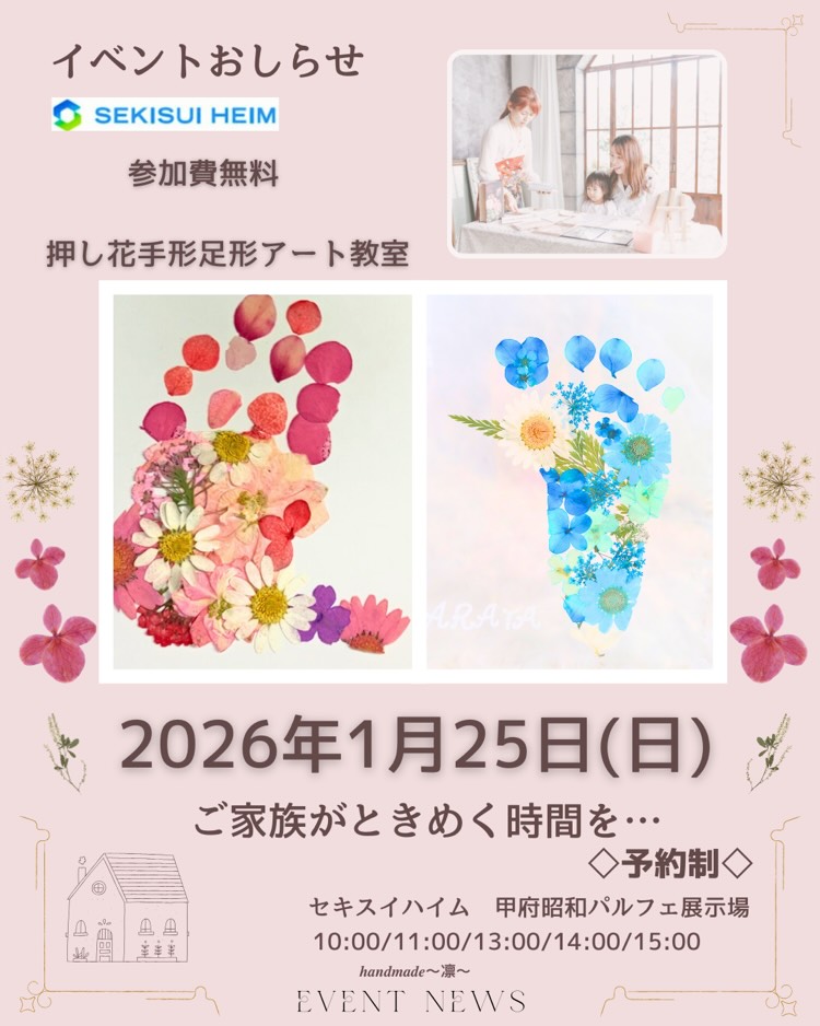 セキスイハイム甲府昭和パルフェ展示場にて、親子で楽しめる「押し花手形足形アート教室」を開催します。