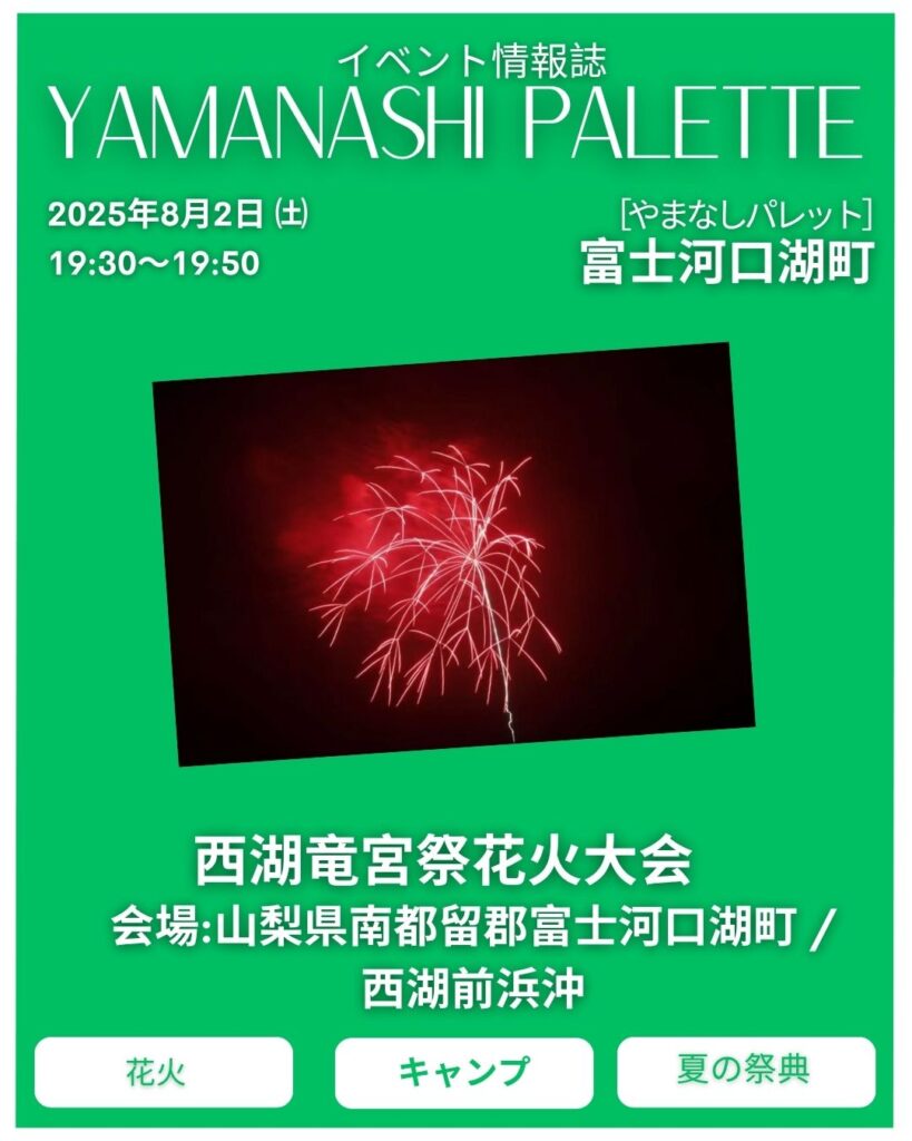 山梨県にお住まいの皆さん、今年の夏はどこに行こうかお悩みではありませんか? 10代から70代まで、幅広い世代におすすめしたい夏の祭典「西湖竜宮祭花火大会」が、 富士河口湖町で開催されます! 水の神様を祀る伝統的なお祭りとして、 地域の方々に愛さ... -