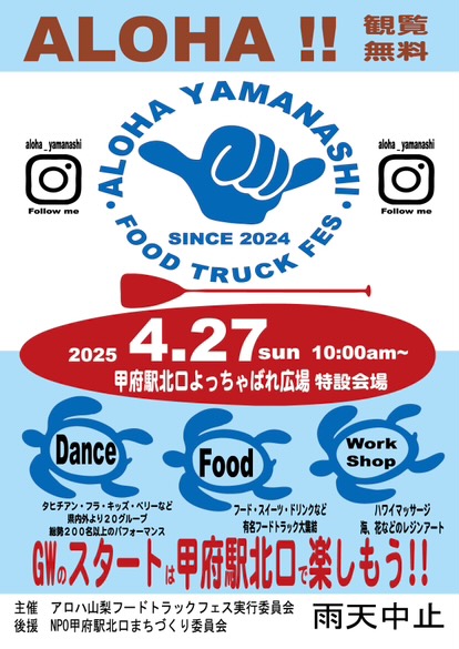 山梨の中心から町づくりイベントへ 「アロハ山梨フードトラックフェス」が甲府駅北口を舞台に開催されます。 フラダンスやタヒチアンダンスを中心に、山梨を盛り上げる町づくりイベントとして皆様をお迎えします。 スタッフはすべてボランティアで、心を込...