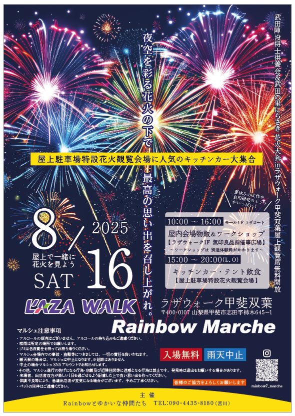 夏の思い出を彩る「Rainbow🌈マルシェ 宮川」が、今年もラザウォーク甲斐双葉で開催されます! 屋内外で楽しめる盛りだくさんのマルシェイベント、ぜひご家族・ご友人と一緒にご来場ください♪ 開催概要 ▶ 日時: 2025年8月16日(土) ɛ... -