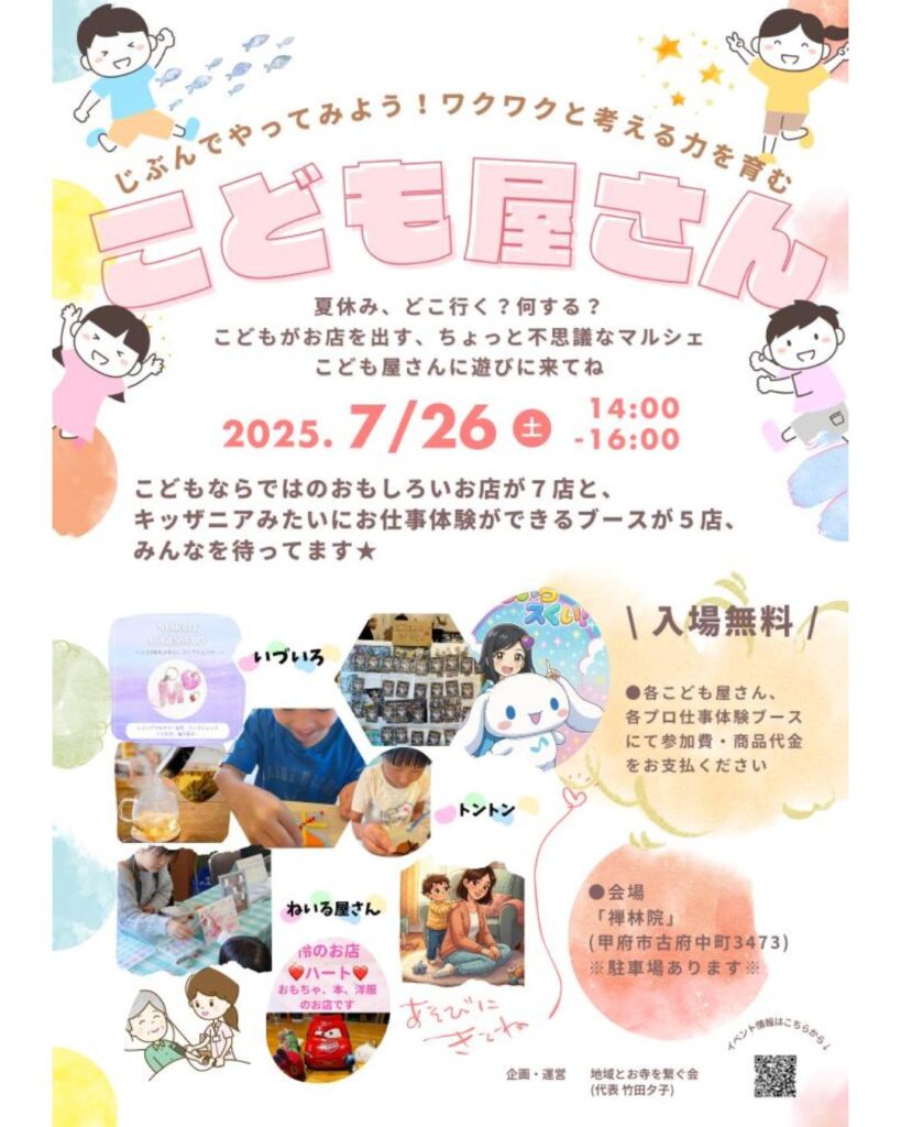 今年の夏は、子どもたちの「やってみたい!」を応援する特別なイベントが甲府市で開催されます! 7月26日(土)に禅林院で開かれる「こども屋さん」は、子どもたちが自ら考え、企画し、運営する、まさに“子どもによる子どものための”マルシェ。 入場無料で... -