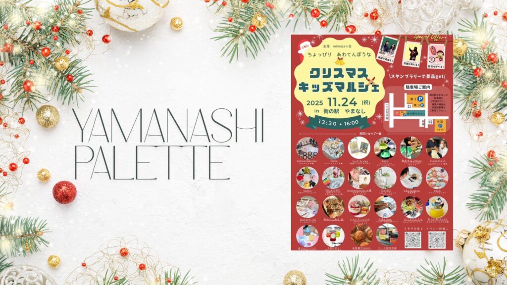 今年の冬、山梨市で子どもたちの笑顔があふれる素敵なイベントが開催されます! その名も 「ちょっぴりあわてんぼうなクリスマスキッズマルシェ」。 子どもたちにさまざまな体験をしてほしい──そんな思いから、子育て中のママたちが企画した温かいイベント... -