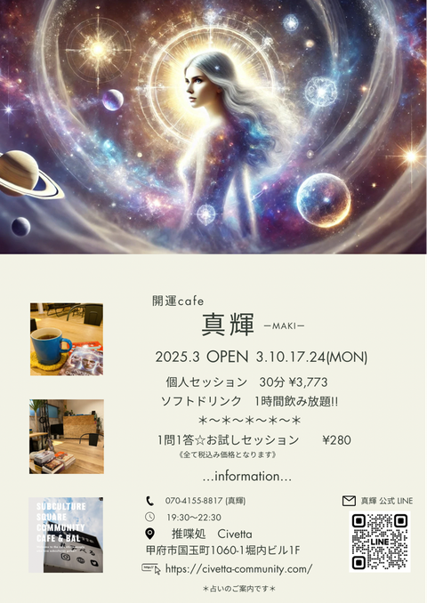 開運cafe 真輝 -MAKI- のイベント情報 特別なイベントのお知らせがあります。開運cafe 真輝 -MAKI- では、2025年3月24日(月)に特別なスピリチュアルイベントを開催します。ぜひお越しください! イベント内容 ☆ 1問1答お試しセッション オラクルカードを...
