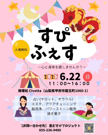 こんにちは!日々忙しく過ごされている皆さん、 心や身体の疲れを感じていませんか?今回は、 そんな皆さんにぴったりの素敵なイベントのお知らせです。 心と身体に優しい癒やしの祭典「すぴふぇす」が初開催! 山梨県にお住まいの皆さんに朗報です! 「第... -