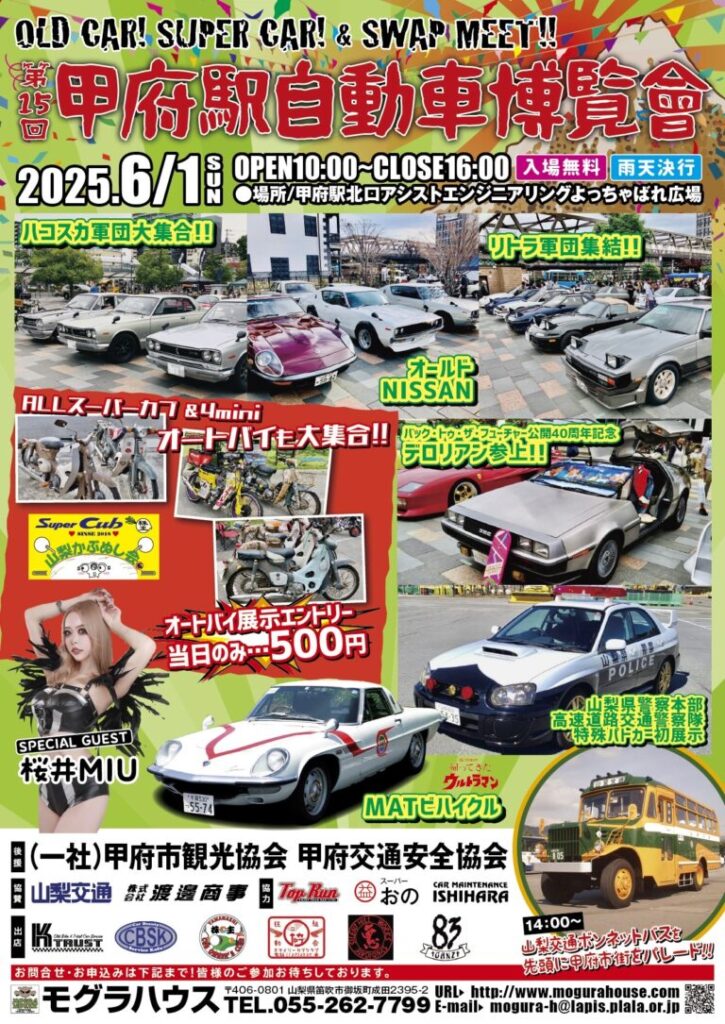 山梨県にお住まいの皆さん! 車好きなら見逃せないイベントが今年もやってきます! 「第15回甲府市自動車博覧会」が、 6月1日(日)にJR甲府駅北口のよっちゃばれ広場で開催されます この博覧会の魅力は、 なんと言ってもその多彩なコンテンツです。 2輪・4... -