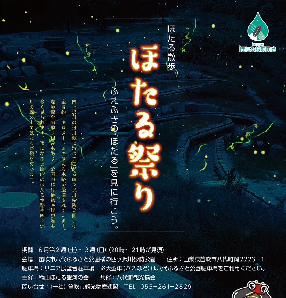 10代の学生さんから70代のご夫婦まで 幅広い世代におすすめの、 笛吹市八代町で開催される 「四ッ沢川 ほたる祭り」を紹介します! 🌟 四ッ沢川砂防公園が光り輝く幻想空間に! 八代ふるさと公園のすぐ横に位置する 「四ッ沢川砂防公園」。 この公... -